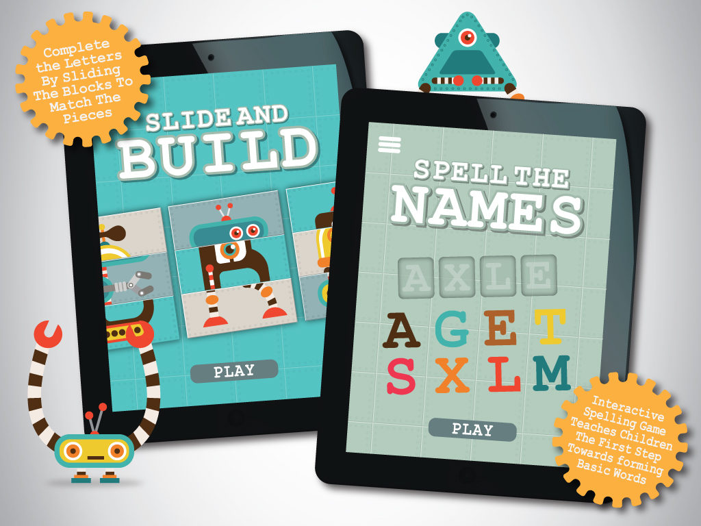 • SLIDE: Slide the pieces to create robot letter characters. This game helps children developing effective problem solving skill.